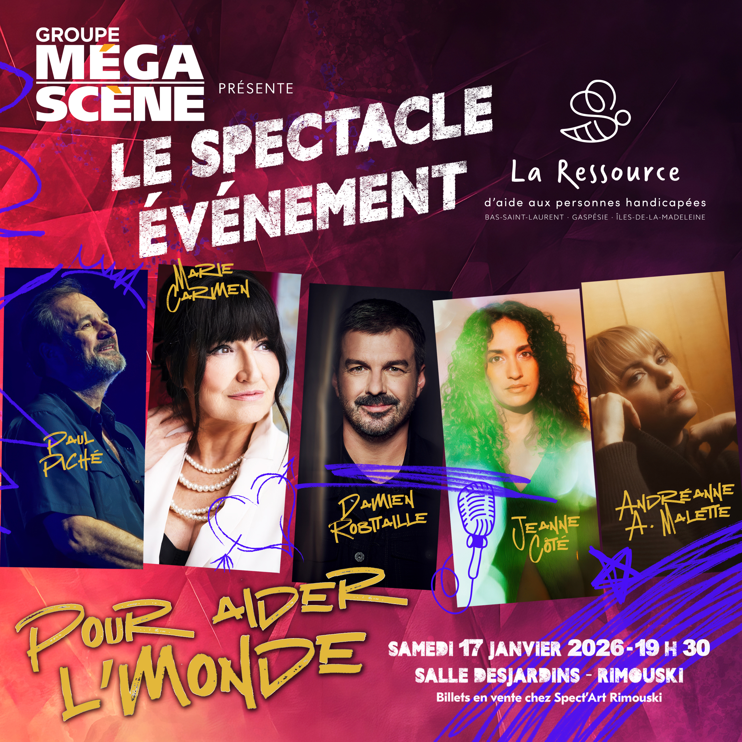 Le 17 janvier prochain, La Ressource présentera son Spectacle-Événement à la Salle Desjardins de Rimouski. Sous la thématique Pour aider l’monde, le spectacle met en lumière Marie Carmen, Paul Piché, Andréanne A. Malette, Damien Robitaille et Jeanne Côté.