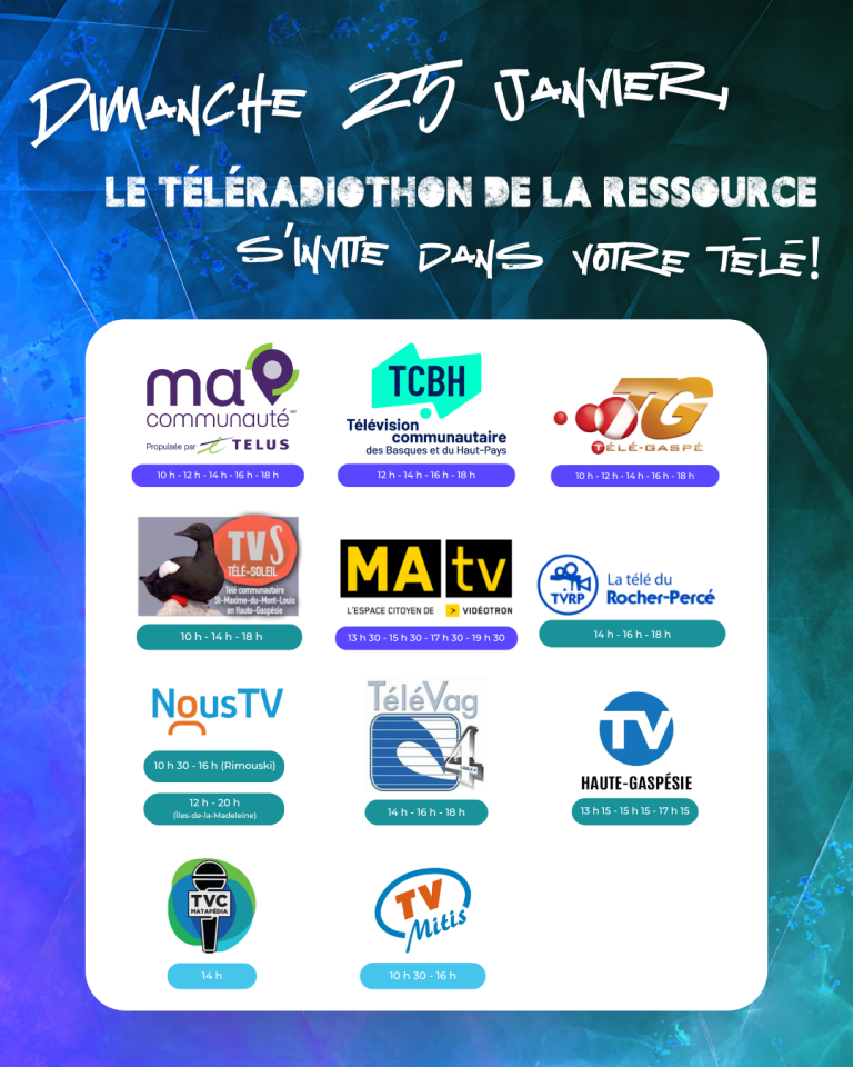 Diffusé sur le web et sur l’ensemble des télés communautaires du Bas-Saint-Laurent, de la Gaspésie et des Îles-de-la-Madeleine, l’événement présentera les meilleurs moments de notre Spectacle-Événement, qui sera capté le 17 janvier à la Salle Desjardins de Rimouski.